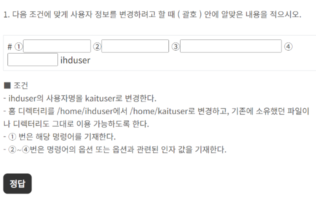 1. 다음 조건에 맞게 사용자 정보를 변경하려고 할 때 ( 괄호 ) 안에 알맞은 내용을 적으시오. # ① ② ③ ④ ihduser ■ 조건 - ihduser의 사용자명을 kaituser로 변경한다. - 홈 디렉터리를 /home/ihduser에서