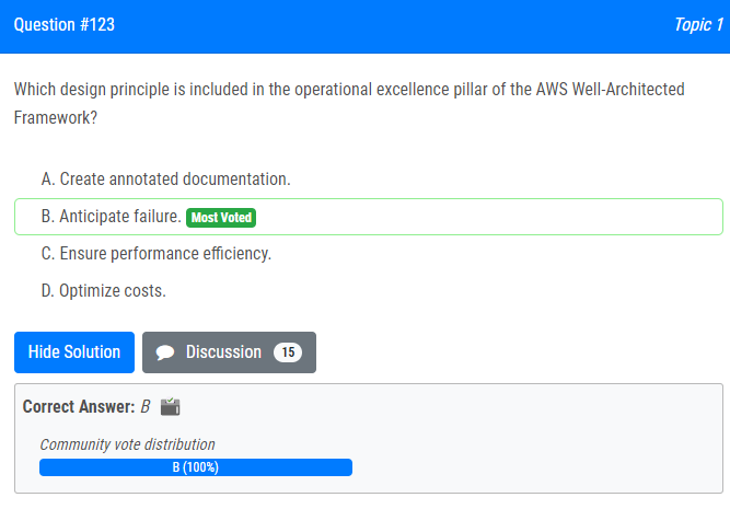 | 13.AWS Well-Architected 프레임워크의 운영 우수성에 포함된 설계 원칙은 무엇입니까? A. 주석이 달린 문서를 만듭니다. B. 실패를 예상하십시오. C. 성능 효율성을 보장합니다. D. 비용을 최적화합니다. Which design principle is included in the operational excellence pillar of the AWS Well-Architected Framework? A. Create annotated documentation. B. Anticipate failure. C. Ensure performance efficiency. D. Optimize costs. |