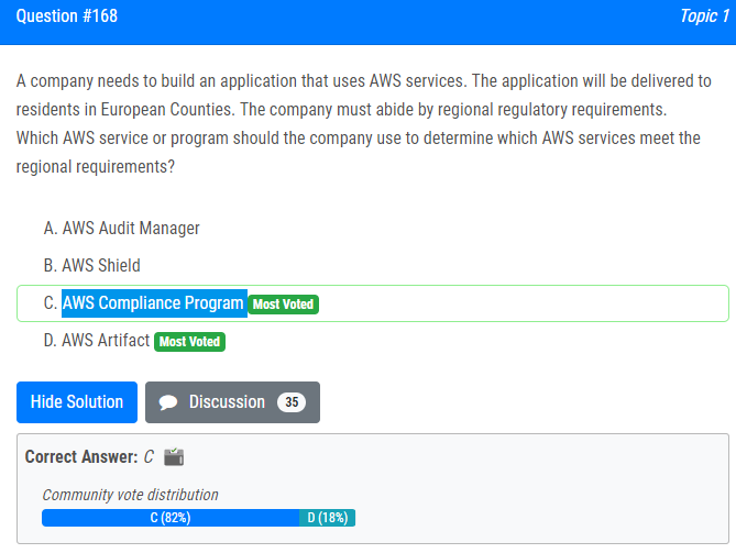 | 20.회사는 AWS 서비스를 사용하는 애플리케이션을 구축해야 합니다. 신청서는 유럽 카운티 거주자에게 전달됩니다. 회사는 지역 규제 요건을 준수해야 합니다. 지역 요구 사항을 충족하는 AWS 서비스를 결정하기 위해 회사에서 사용해야 하는 AWS 서비스 또는 프로그램은 무엇입니까? A. AWS 감사 관리자 B. AWS 쉴드 C. AWS 규정 준수 프로그램 D. AWS 아티팩트 A company needs to build an application that uses AWS services. The application will be delivered to residents in European Counties. The company must abide by regional regulatory requirements. Which AWS service or program should the company use to determine which AWS services meet the regional requirements? A. AWS Audit Manager B. AWS Shield C. AWS Compliance Program D. AWS Artifact |