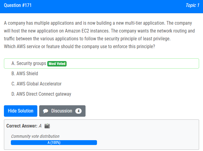 | 22.한 회사에 여러 애플리케이션이 있으며 현재 새로운 다중 계층 애플리케이션을 구축하고 있습니다. 회사는 Amazon EC2 인스턴스에서 새 애플리케이션을 호스팅합니다. 회사는 다양한 애플리케이션 간의 네트워크 라우팅 및 트래픽이 최소 권한의 보안 원칙을 따르기를 원합니다. 회사에서 이 원칙을 시행하기 위해 사용해야 하는 AWS 서비스 또는 기능은 무엇입니까? A. 보안 그룹 B. AWS 쉴드 C. AWS 글로벌 액셀러레이터 D. AWS Direct Connect 게이트웨이 A company has multiple applications and is now building a new multi-tier application. The company will host the new application on Amazon EC2 instances. The company wants the network routing and traffic between the various applications to follow the security principle of least privilege. Which AWS service or feature should the company use to enforce this principle? A. Security groups B. AWS Shield C. AWS Global Accelerator D. AWS Direct Connect gateway |