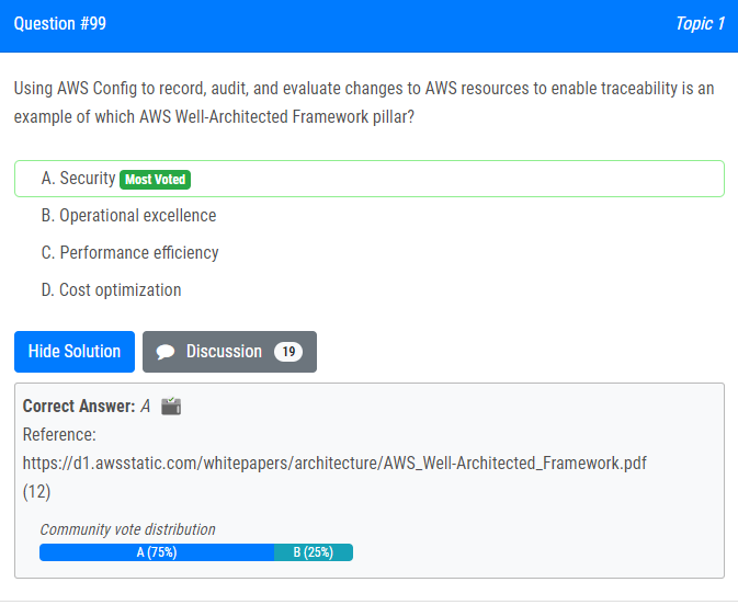 | 5.Using AWS Config to record, audit, and evaluate changes to AWS resources to enable traceability is an example of which AWS Well-Architected Framework pillar? A. Security B. Operational excellence C. Performance efficiency D. Cost optimization AWS Config를 사용하여 추적 가능성을 활성화하기 위해 AWS 리소스에 대한 변경 사항을 기록, 감사 및 평가하는 것은 다음 중 AWS Well-Architected 프레임워크 기둥의 예입니다. 가. 보안 B. 운영 우수성 C. 성능 효율성 D. 비용 최적화 |