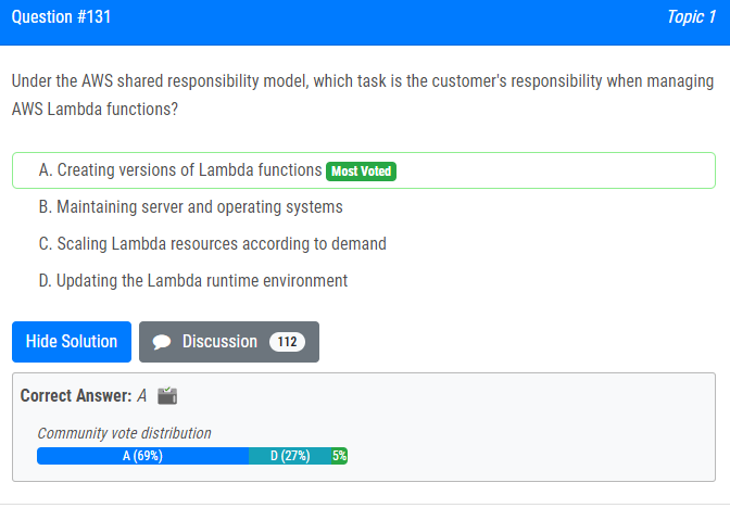 | 14.AWS 공유 책임 모델에서 AWS Lambda 기능을 관리할 때 고객이 책임지는 작업은 무엇입니까? A. Lambda 함수 버전 생성 나. 서버 및 운영체제 유지 C. 수요에 따라 Lambda 리소스 확장 D. Lambda 런타임 환경 업데이트 Under the AWS shared responsibility model, which task is the customer's responsibility when managing AWS Lambda functions? A. Creating versions of Lambda functions B. Maintaining server and operating systems C. Scaling Lambda resources according to demand D. Updating the Lambda runtime environment |