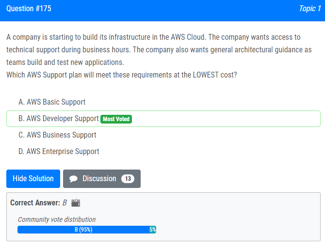 | 23.A company is starting to build its infrastructure in the AWS Cloud. The company wants access to technical support during business hours. The company also wants general architectural guidance as teams build and test new applications. Which AWS Support plan will meet these requirements at the LOWEST cost? A. AWS Basic Support B. AWS Developer Support C. AWS Business Support D. AWS Enterprise Support 한 회사가 AWS 클라우드에서 인프라를 구축하기 시작했습니다. 회사는 업무 시간 동안 기술 지원에 액세스하기를 원합니다. 회사는 또한 팀이 새로운 애플리케이션을 빌드하고 테스트할 때 일반적인 아키텍처 지침을 원합니다. 가장 저렴한 비용으로 이러한 요구 사항을 충족하는 AWS Support 플랜은 무엇입니까? A. AWS 기본 지원 B. AWS 개발자 지원 C. AWS 비즈니스 지원 D. AWS 엔터프라이즈 지원 |