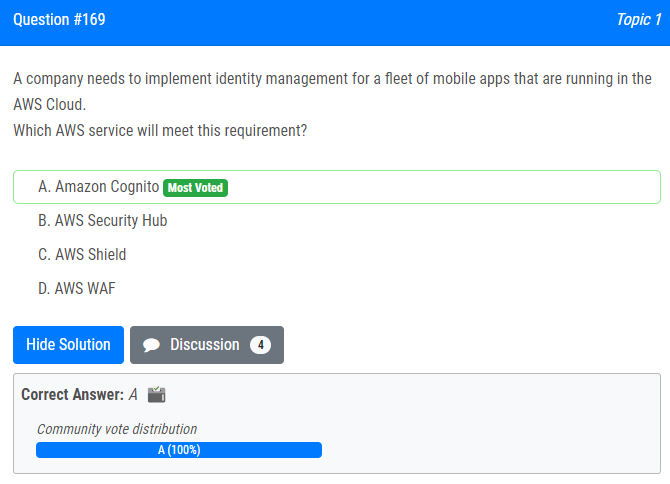 | 21.회사는 AWS 클라우드에서 실행 중인 모바일 앱 플릿에 대한 자격 증명 관리를 구현해야 합니다. 이 요구 사항을 충족하는 AWS 서비스는 무엇입니까? A. 아마존 코그니토 B. AWS 보안 허브 C. AWS 실드 D. AWS WAF A company needs to implement identity management for a fleet of mobile apps that are running in the AWS Cloud. Which AWS service will meet this requirement? A. Amazon Cognito B. AWS Security Hub C. AWS Shield D. AWS WAF |