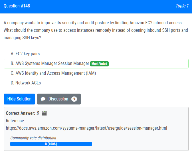 | 18.회사는 Amazon EC2 인바운드 액세스를 제한하여 보안 및 감사 상태를 개선하려고 합니다. 회사는 인바운드 SSH 포트를 열고 SSH 키를 관리하는 대신 원격으로 인스턴스에 액세스하기 위해 무엇을 사용해야 합니까? A. EC2 키 쌍 B. AWS 시스템 관리자 세션 관리자 C. AWS 자격 증명 및 액세스 관리(IAM) D. 네트워크 ACL A company wants to improve its security and audit posture by limiting Amazon EC2 inbound access. What should the company use to access instances remotely instead of opening inbound SSH ports and managing SSH keys? A. EC2 key pairs B. AWS Systems Manager Session Manager C. AWS Identity and Access Management (IAM) D. Network ACLs |