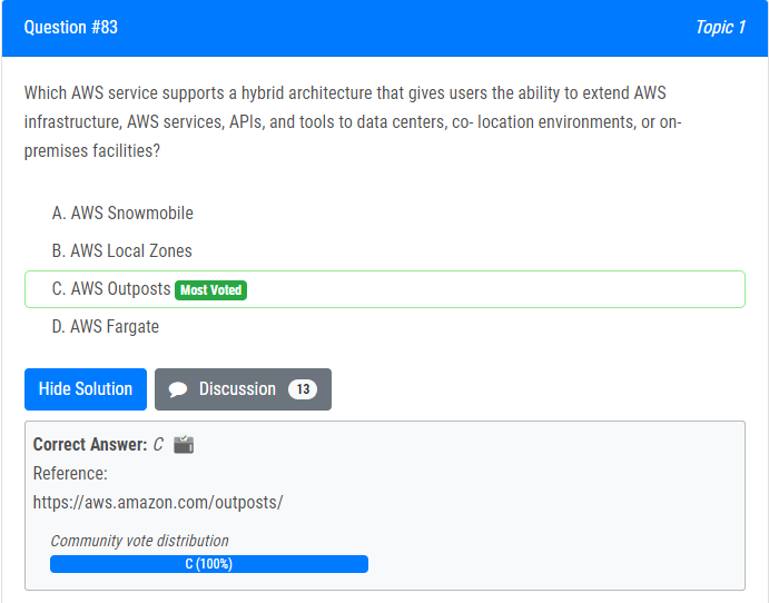 | 1.사용자에게 AWS 인프라, AWS 서비스, API 및 도구를 데이터 센터, 코로케이션 환경 또는 온프레미스 시설로 확장할 수 있는 기능을 제공하는 하이브리드 아키텍처를 지원하는 AWS 서비스는 무엇입니까? A. AWS 스노우모빌 B. AWS 로컬 영역 C. AWS 전초기지 D. AWS 파게이트 |