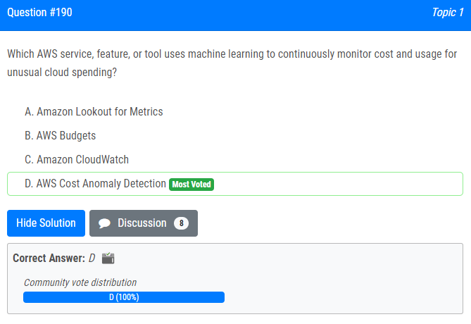 | 27.기계 학습을 사용하여 비정상적인 클라우드 지출에 대한 비용 및 사용량을 지속적으로 모니터링하는 AWS 서비스, 기능 또는 도구는 무엇입니까? A. Amazon Lookout for Metrics B. AWS 예산 C. 아마존 클라우드워치 D. AWS 비용 이상 감지 Which AWS service, feature, or tool uses machine learning to continuously monitor cost and usage for unusual cloud spending? A. Amazon Lookout for Metrics B. AWS Budgets C. Amazon CloudWatch D. AWS Cost Anomaly Detection |