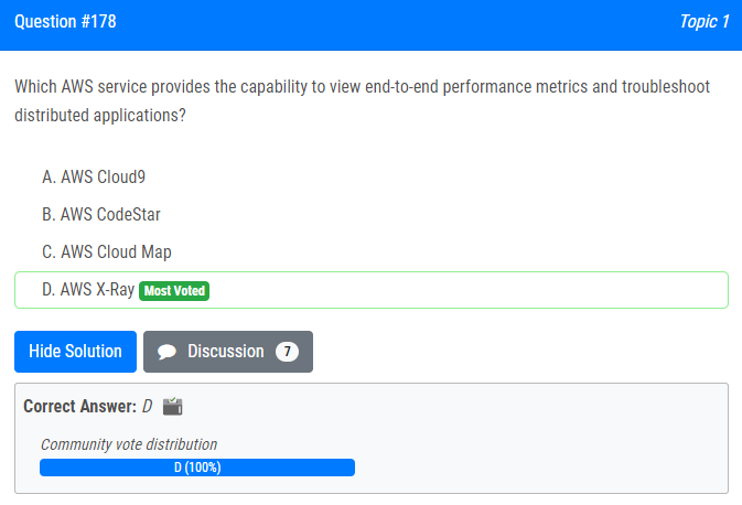 | 24.엔드 투 엔드 성능 지표를 보고 분산 애플리케이션 문제를 해결할 수 있는 기능을 제공하는 AWS 서비스는 무엇입니까? A. AWS 클라우드9 B. AWS 코드스타 C. AWS 클라우드 맵 D. AWS 엑스레이 Which AWS service provides the capability to view end-to-end performance metrics and troubleshoot distributed applications? A. AWS Cloud9 B. AWS CodeStar C. AWS Cloud Map D. AWS X-Ray |