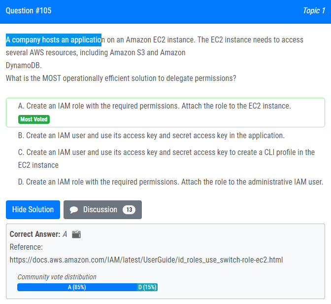 | 8.A company hosts an application on an Amazon EC2 instance. The EC2 instance needs to access several AWS resources, including Amazon S3 and Amazon DynamoDB. What is the MOST operationally efficient solution to delegate permissions? A. Create an IAM role with the required permissions. Attach the role to the EC2 instance. B. Create an IAM user and use its access key and secret access key in the application. C. Create an IAM user and use its access key and secret access key to create a CLI profile in the EC2 instance D. Create an IAM role with the required permissions. Attach the role to the administrative IAM user. 회사는 Amazon EC2 인스턴스에서 애플리케이션을 호스팅합니다. EC2 인스턴스는 Amazon S3 및 Amazon DynamoDB를 비롯한 여러 AWS 리소스에 액세스해야 합니다. 권한을 위임하기 위한 운영상 가장 효율적인 솔루션은 무엇입니까? A. 필요한 권한을 가진 IAM 역할을 생성합니다. 역할을 EC2 인스턴스에 연결합니다. B. IAM 사용자를 생성하고 해당 액세스 키와 보안 액세스 키를 애플리케이션에서 사용합니다. C. IAM 사용자를 생성하고 액세스 키와 보안 액세스 키를 사용하여 EC2 인스턴스에서 CLI 프로필을 생성합니다. D. 필요한 권한이 있는 IAM 역할을 생성합니다. 관리 IAM 사용자에게 역할을 연결합니다. |