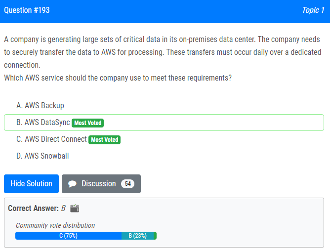 | 28.회사는 온프레미스 데이터 센터에서 대량의 중요한 데이터 세트를 생성하고 있습니다. 회사는 처리를 위해 데이터를 AWS로 안전하게 전송해야 합니다. 이러한 전송은 전용 연결을 통해 매일 발생해야 합니다. 회사에서 이러한 요구 사항을 충족하려면 어떤 AWS 서비스를 사용해야 합니까? A. AWS 백업 B. AWS 데이터싱크 C. AWS 다이렉트 커넥트 D. AWS 스노우볼 A company is generating large sets of critical data in its on-premises data center. The company needs to securely transfer the data to AWS for processing. These transfers must occur daily over a dedicated connection. Which AWS service should the company use to meet these requirements? A. AWS Backup B. AWS DataSync C. AWS Direct Connect D. AWS Snowball |