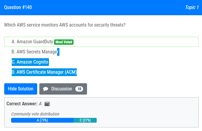 | 17.보안 위협에 대해 AWS 계정을 모니터링하는 AWS 서비스는 무엇입니까? A. Amazon GuardDuty B. AWS 비밀 관리자 C. 아마존 코그니토 D. AWS 인증서 관리자(ACM) Which AWS service monitors AWS accounts for security threats? A. Amazon GuardDuty B. AWS Secrets Manager C. Amazon Cognito D. AWS Certificate Manager (ACM) |
