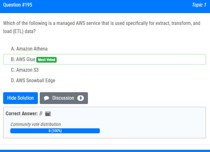 | 29.다음 중 특히 ETL(추출, 변환 및 로드) 데이터에 사용되는 관리형 AWS 서비스는 무엇입니까? A. 아마존 아테나 B. AWS 글루 다. 아마존 S3 D. AWS Snowball 에지 Which of the following is a managed AWS service that is used specifically for extract, transform, and load (ETL) data? A. Amazon Athena B. AWS Glue C. Amazon S3 D. AWS Snowball Edge |