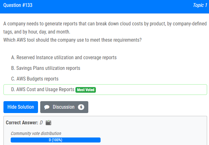 | 15.회사는 제품, 회사 정의 태그, 시간, 일, 월별로 클라우드 비용을 분류할 수 있는 보고서를 생성해야 합니다. 회사에서 이러한 요구 사항을 충족하려면 어떤 AWS 도구를 사용해야 합니까? A. 예약 인스턴스 사용률 및 적용 범위 보고서 B. Savings Plans 사용 보고서 C. AWS 예산 보고서 D. AWS 비용 및 사용 보고서 A company needs to generate reports that can break down cloud costs by product, by company-defined tags, and by hour, day, and month. Which AWS tool should the company use to meet these requirements? A. Reserved Instance utilization and coverage reports B. Savings Plans utilization reports C. AWS Budgets reports D. AWS Cost and Usage Reports |