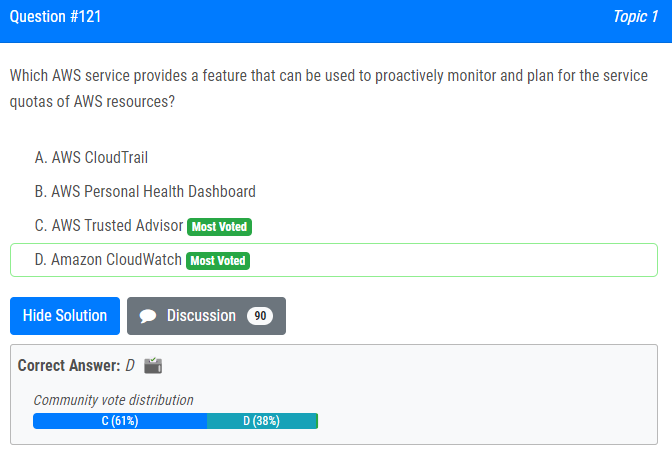 | 12.Which AWS service provides a feature that can be used to proactively monitor and plan for the service quotas of AWS resources? A. AWS CloudTrail B. AWS Personal Health Dashboard C. AWS Trusted Advisor D. Amazon CloudWatch AWS 리소스의 서비스 할당량을 사전에 모니터링하고 계획하는 데 사용할 수 있는 기능을 제공하는 AWS 서비스는 무엇입니까? A. AWS 클라우드트레일 B. AWS Personal Health Dashboard C. AWS 신뢰할 수 있는 조언자 D. 아마존 클라우드워치 |
