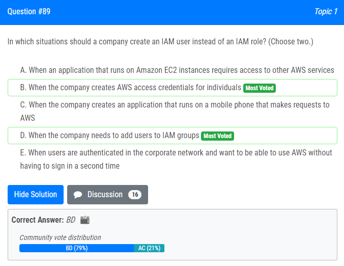 | 4.회사는 어떤 상황에서 IAM 역할 대신 IAM 사용자를 생성해야 합니까? (두 가지를 선택하세요.) A. Amazon EC2 인스턴스에서 실행되는 애플리케이션이 다른 AWS 서비스에 액세스해야 하는 경우 나. 회사가 개인의 AWS 접근 자격 증명을 생성하는 경우 다. 회사가 AWS에 요청하는 휴대폰에서 실행되는 애플리케이션을 생성하는 경우 D. 회사에서 IAM 그룹에 사용자를 추가해야 하는 경우 E. 사용자가 회사 네트워크에서 인증을 받고 두 번째 로그인 없이 AWS를 사용할 수 있기를 원하는 경우 |