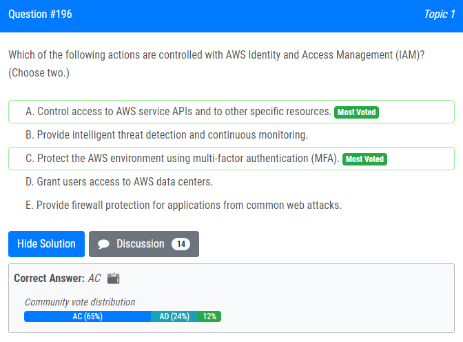 | 30.다음 중 AWS Identity and Access Management(IAM)로 제어되는 작업은 무엇입니까? (두 가지를 선택하세요.) A. AWS 서비스 API 및 기타 특정 리소스에 대한 액세스를 제어합니다. B. 지능형 위협 탐지 및 지속적인 모니터링을 제공합니다. C. MFA(Multi-Factor Authentication)를 사용하여 AWS 환경을 보호합니다. D. 사용자에게 AWS 데이터 센터에 대한 액세스 권한을 부여합니다. E. 일반적인 웹 공격으로부터 애플리케이션에 대한 방화벽 보호를 제공합니다. Which of the following actions are controlled with AWS Identity and Access Management (IAM)? (Choose two.) A. Control access to AWS service APIs and to other specific resources. B. Provide intelligent threat detection and continuous monitoring. C. Protect the AWS environment using multi-factor authentication (MFA). D. Grant users access to AWS data centers. E. Provide firewall protection for applications from common web attacks. |