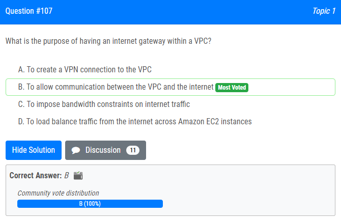 | 9.What is the purpose of having an internet gateway within a VPC? A. To create a VPN connection to the VPC B. To allow communication between the VPC and the internet C. To impose bandwidth constraints on internet traffic D. To load balance traffic from the internet across Amazon EC2 instances VPC 내에 인터넷 게이트웨이를 갖는 목적은 무엇입니까? A. VPC에 대한 VPN 연결을 생성하려면 B. VPC와 인터넷 간의 통신을 허용하기 위해 C. 인터넷 트래픽에 대역폭 제약을 부과하기 위해 D. Amazon EC2 인스턴스 간에 인터넷 트래픽 로드 밸런싱 |