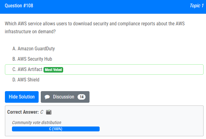 | 10.Which AWS service allows users to download security and compliance reports about the AWS infrastructure on demand? A. Amazon GuardDuty B. AWS Security Hub C. AWS Artifact D. AWS Shield 사용자가 주문형 AWS 인프라에 대한 보안 및 규정 준수 보고서를 다운로드할 수 있는 AWS 서비스는 무엇입니까? A. Amazon GuardDuty B. AWS 보안 허브 C. AWS 아티팩트 D. AWS 실드 |