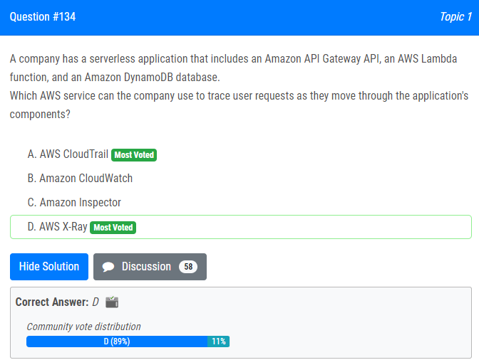 | 16.회사에 Amazon API Gateway API, AWS Lambda 함수 및 Amazon DynamoDB 데이터베이스가 포함된 서버리스 애플리케이션이 있습니다. 사용자가 애플리케이션 구성 요소를 이동할 때 사용자 요청을 추적하기 위해 회사에서 사용할 수 있는 AWS 서비스는 무엇입니까? A. AWS 클라우드트레일 B. 아마존 클라우드워치 C. 아마존 인스펙터 D. AWS 엑스레이 A company has a serverless application that includes an Amazon API Gateway API, an AWS Lambda function, and an Amazon DynamoDB database. Which AWS service can the company use to trace user requests as they move through the application's components? A. AWS CloudTrail B. Amazon CloudWatch C. Amazon Inspector D. AWS X-Ray |