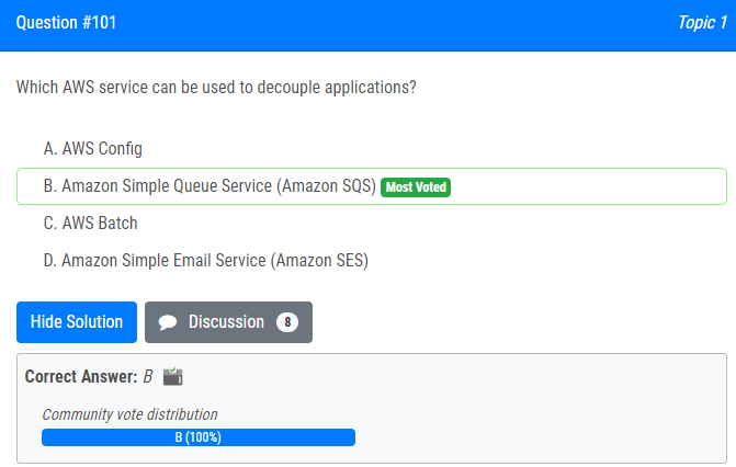 | 6.Which AWS service can be used to decouple applications? A. AWS Config B. Amazon Simple Queue Service (Amazon SQS) C. AWS Batch D. Amazon Simple Email Service (Amazon SES) 애플리케이션을 분리하는 데 사용할 수 있는 AWS 서비스는 무엇입니까? 가. AWS 구성 B. Amazon Simple Queue Service(Amazon SQS) C. AWS 배치 D. Amazon Simple Email Service(Amazon SES) |