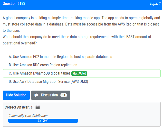 | 26.한 글로벌 기업이 간단한 시간 추적 모바일 앱을 구축하고 있습니다. 앱은 전역적으로 작동해야 하며 수집된 데이터를 데이터베이스에 저장해야 합니다. 데이터는 사용자와 가장 가까운 AWS 리전에서 액세스할 수 있어야 합니다. 최소한의 운영 오버헤드로 이러한 데이터 스토리지 요구 사항을 충족하려면 회사에서 무엇을 해야 합니까? A. 여러 리전에서 Amazon EC2를 사용하여 별도의 데이터베이스 호스팅 B. Amazon RDS 교차 리전 복제 사용 C. Amazon DynamoDB 전역 테이블 사용 D. AWS 데이터베이스 마이그레이션 서비스(AWS DMS) 사용 A global company is building a simple time-tracking mobile app. The app needs to operate globally and must store collected data in a database. Data must be accessible from the AWS Region that is closest to the user. What should the company do to meet these data storage requirements with the LEAST amount of operational overhead? A. Use Amazon EC2 in multiple Regions to host separate databases B. Use Amazon RDS cross-Region replication C. Use Amazon DynamoDB global tables D. Use AWS Database Migration Service (AWS DMS) |