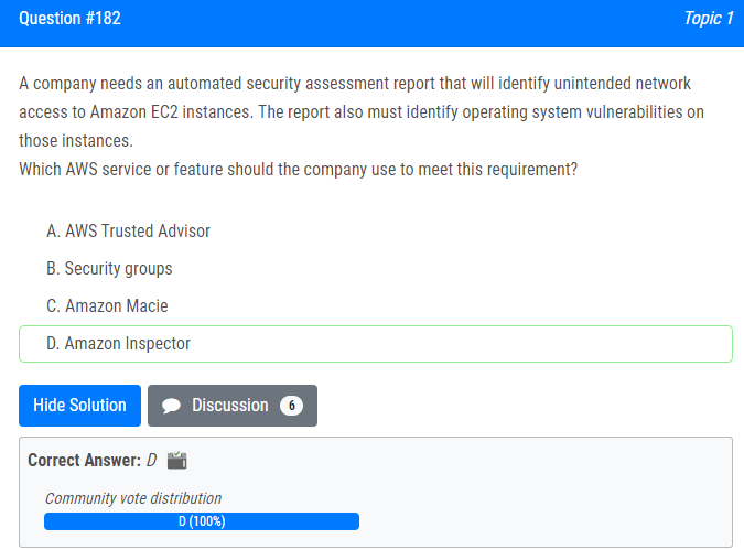 | 25.회사에는 Amazon EC2 인스턴스에 대한 의도하지 않은 네트워크 액세스를 식별하는 자동화된 보안 평가 보고서가 필요합니다. 보고서는 또한 해당 인스턴스에 대한 운영 체제 취약성을 식별해야 합니다. 이 요구 사항을 충족하기 위해 회사에서 사용해야 하는 AWS 서비스 또는 기능은 무엇입니까? A. AWS 신뢰할 수 있는 조언자 B. 보안 그룹 C. 아마존 메이시 D. 아마존 인스펙터 A company needs an automated security assessment report that will identify unintended network access to Amazon EC2 instances. The report also must identify operating system vulnerabilities on those instances. Which AWS service or feature should the company use to meet this requirement? A. AWS Trusted Advisor B. Security groups C. Amazon Macie D. Amazon Inspector |